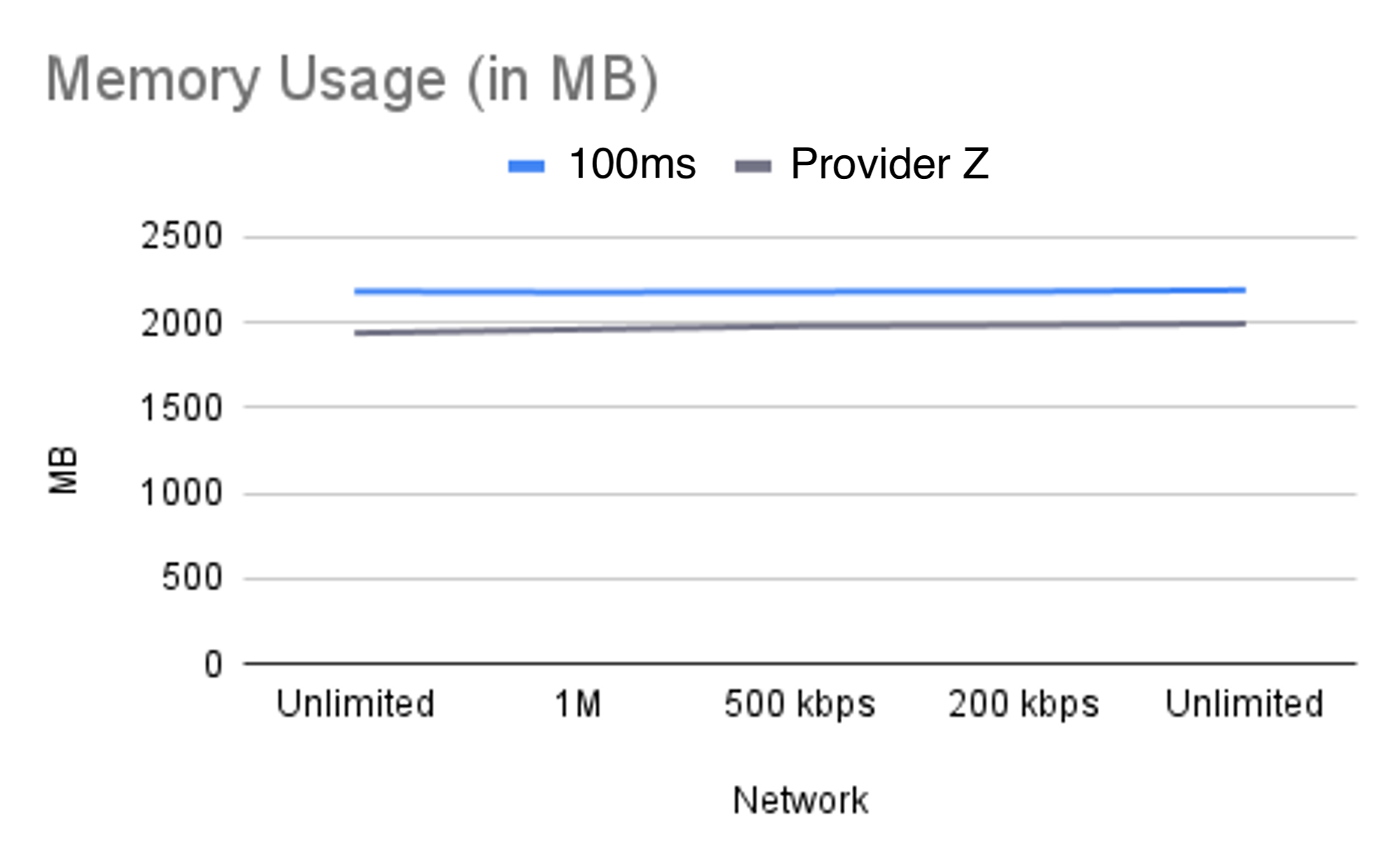 In high-traffic situations that cause network congestion, Provider Z can transmit more frames per second compared to 100ms. The video also freezes less than 100ms. However, it is important to note that this is achieved by compromising latency: 100ms audio and video have significantly lower latency compared to Provider Z. This means as more people join the call and packet loss occurs, the end users will not experience as much lag in audio and video with 100ms as they would with Provider Z.