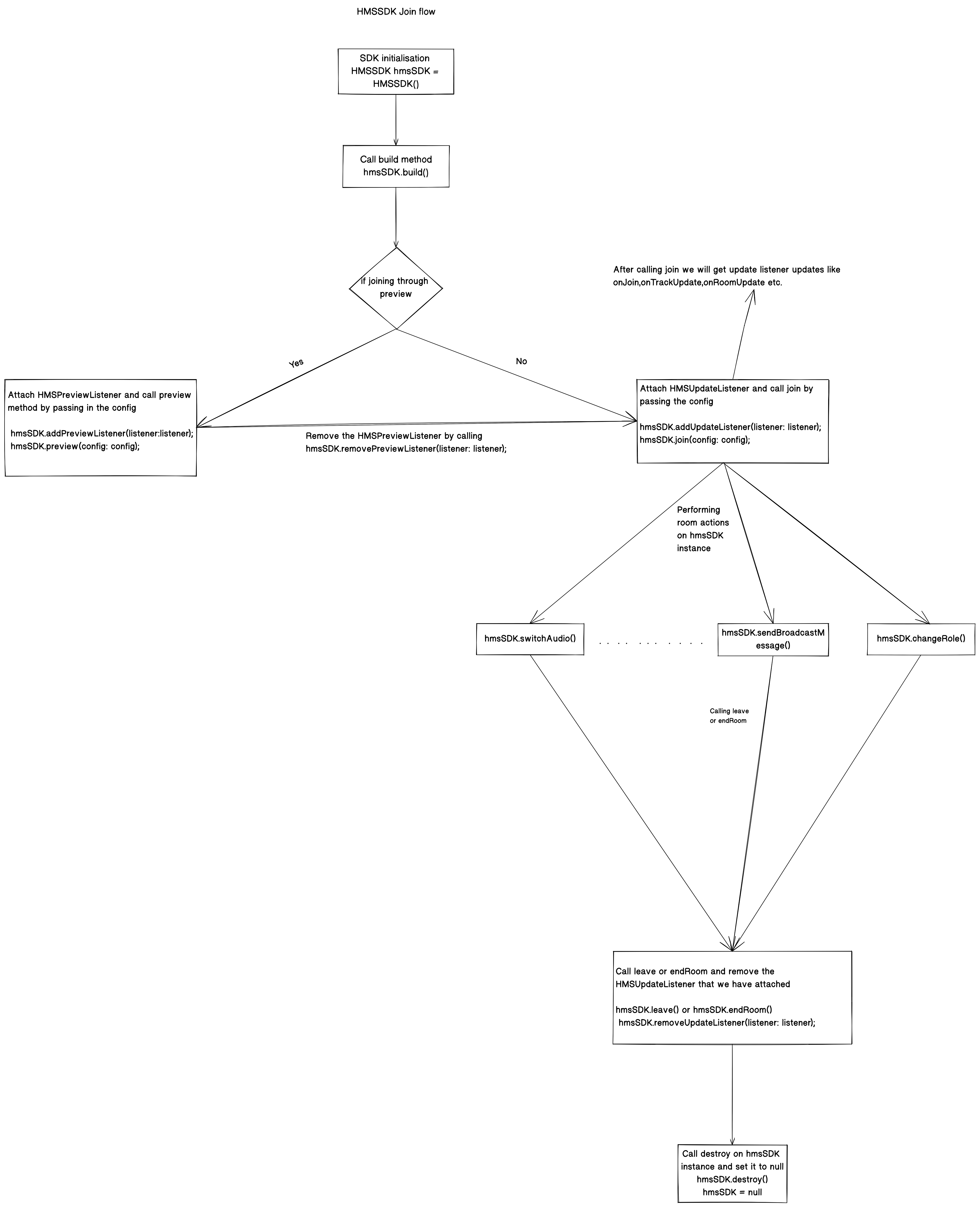 class Meeting implements HMSUpdateListener{ late HMSSDK hmsSDK; Meeting({required HMSSDK hmsSDKFromPreview,HMSConfig configFromPreview}){ hmsSDK = hmsSDKFromPreview; hmsSDK.addUpdateListener(listener: this); hmsSDK.join(config: configFromPreview); } void onJoin({required HMSRoom room}) async { // User Joined successfully. } ... }