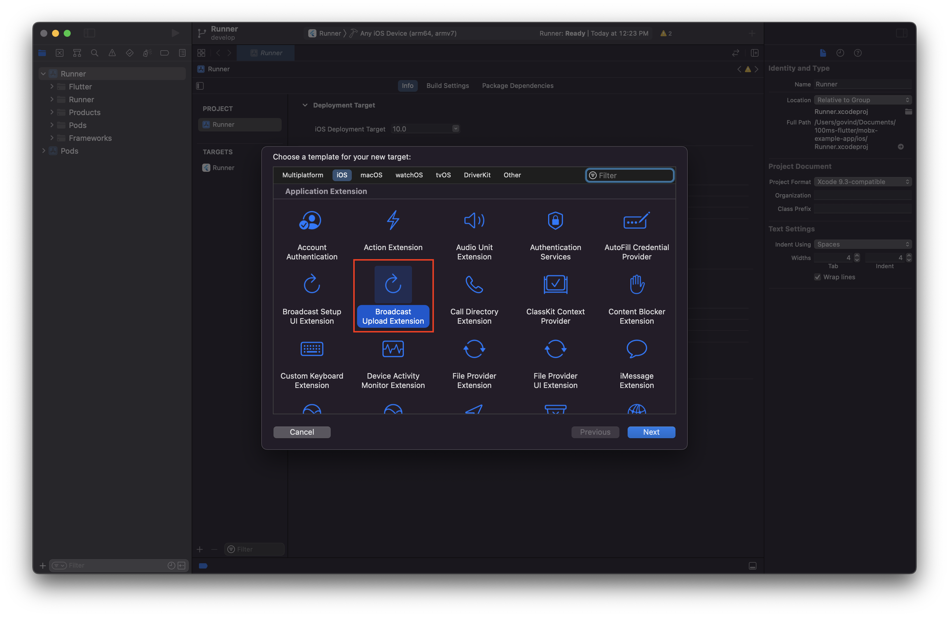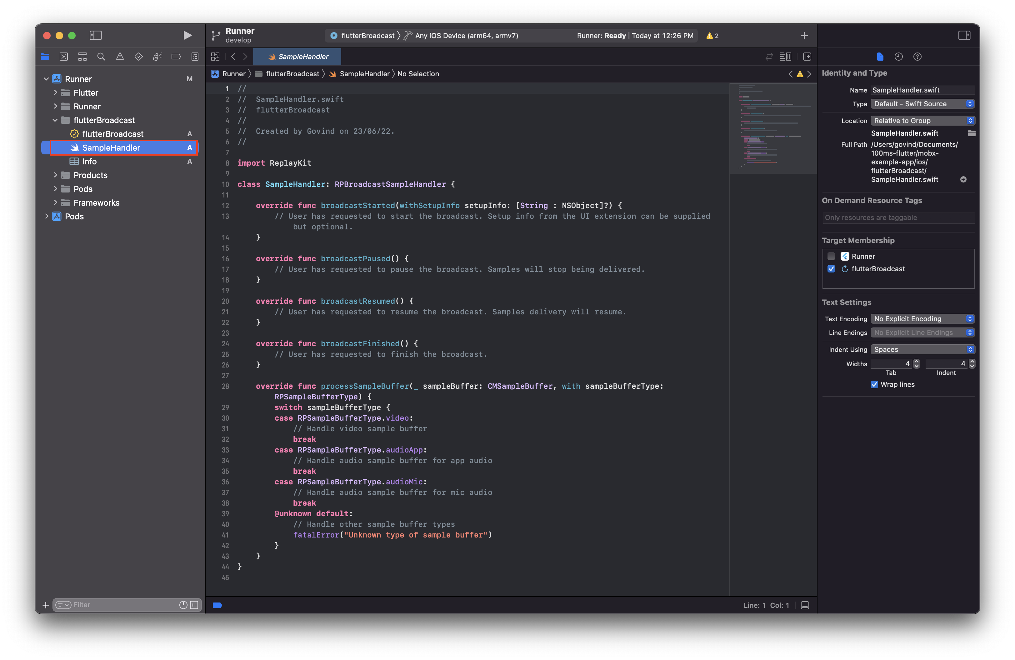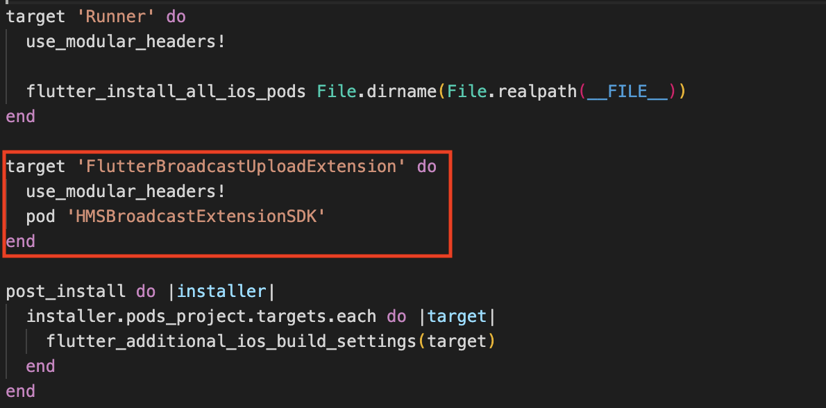 In this sample Podfile, the Target names are Runner and FlutterBroadcastUploadExtension. Change these to the actual Target names defined in your Xcode project.
