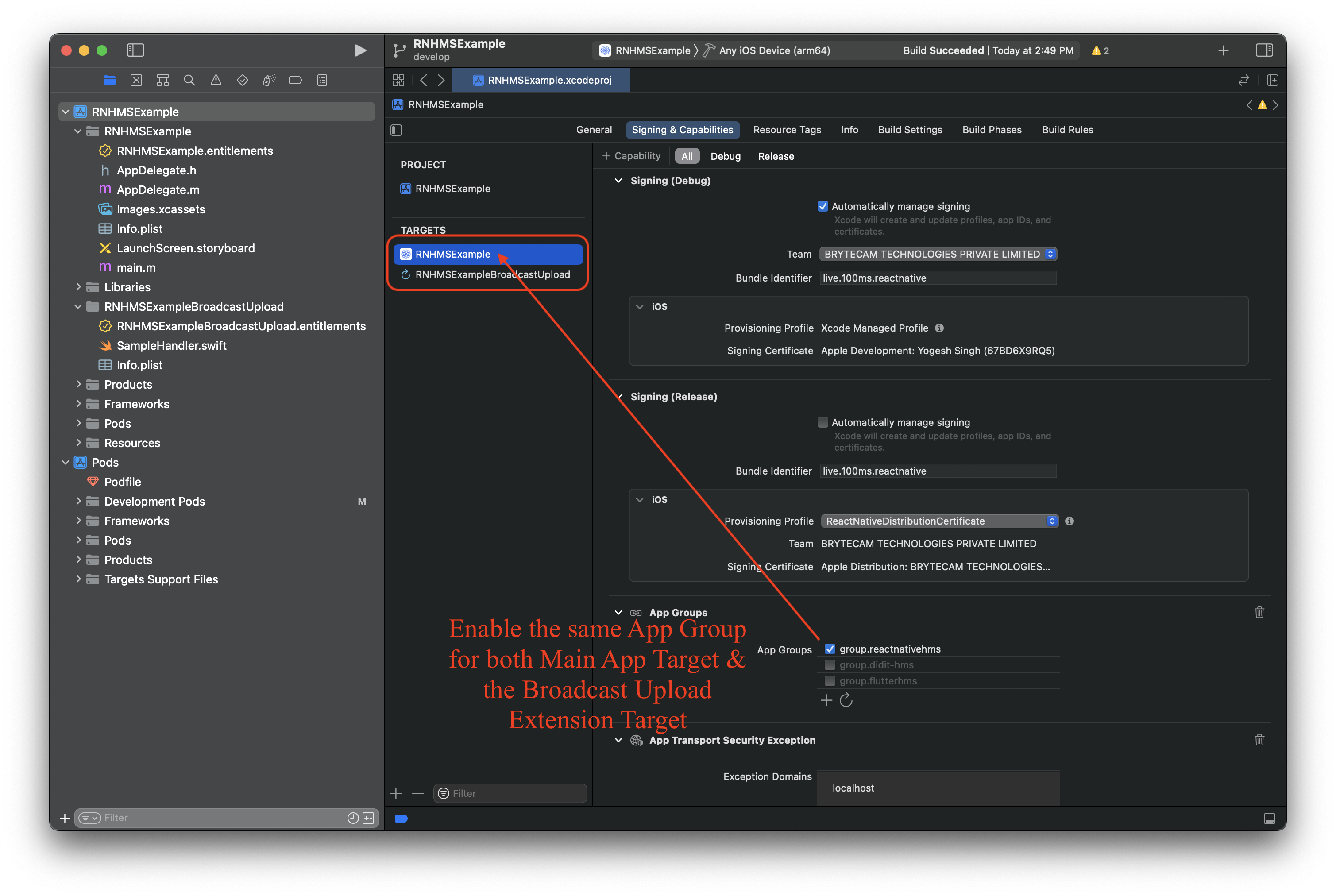 100ms Example Apps already have configurations for starting Screenshare on iOS devices. The values for App Group & Preferred Extension used in 100ms Example Apps cannot be reused by any other apps as they won't be linked to your Apple Developer Account.