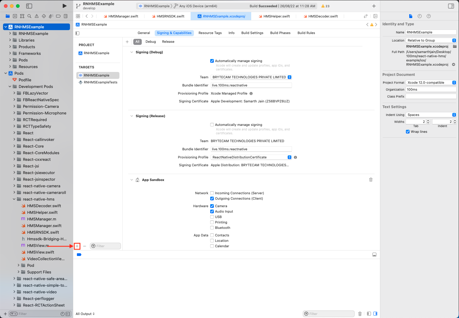 100ms React Native Package is supported for iOS 12 and above versions. Ensure that the Minimum iOS Deployment Target Version is set to 12.0 or above in your Xcode project & the Podfile.