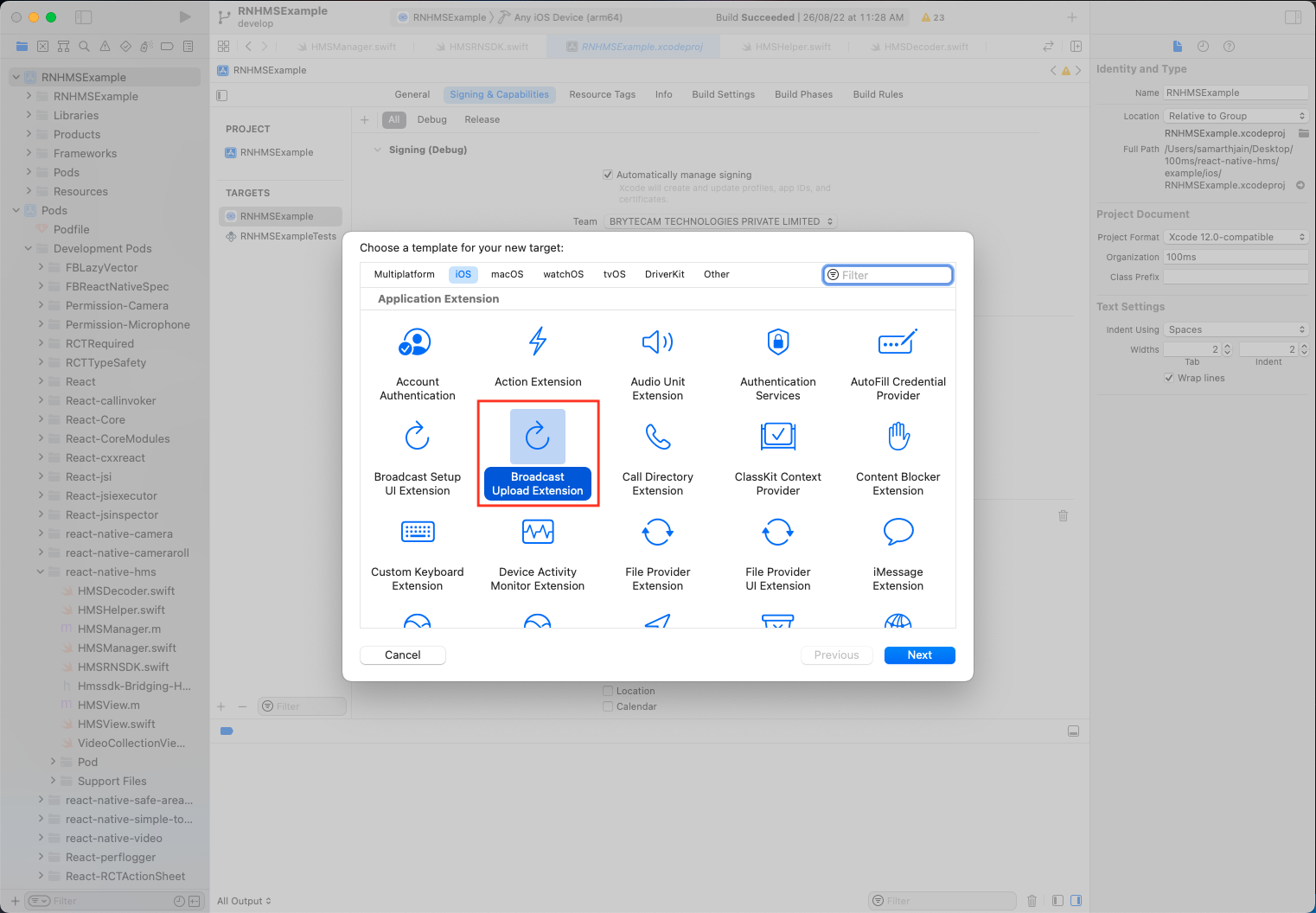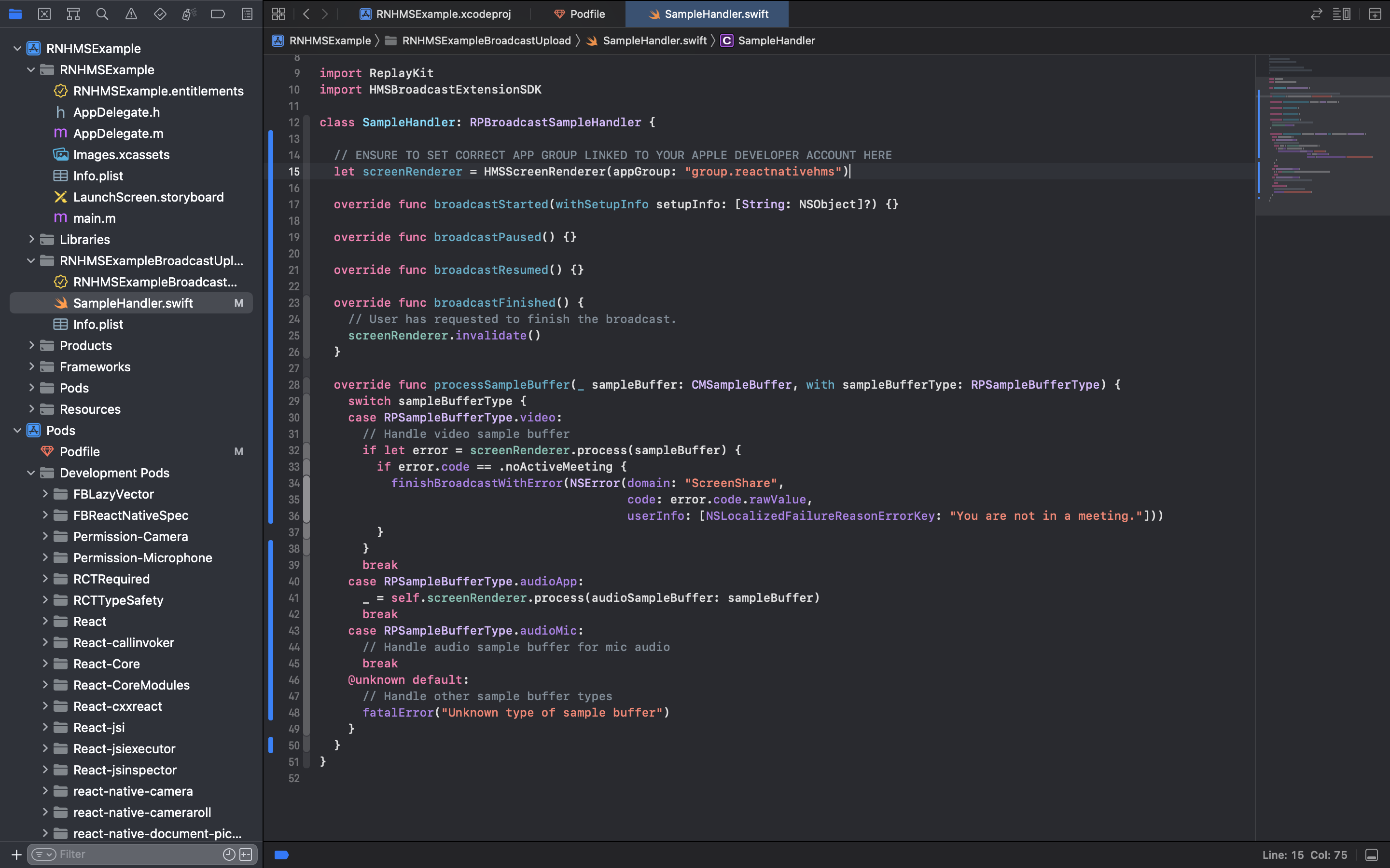 Open the SampleHandler.swift file. It would be available in your TARGET_NAME > ExtensionName Xcode folder. For example, RNHMSExample > ExtensionName then SampleHandler.swift file.