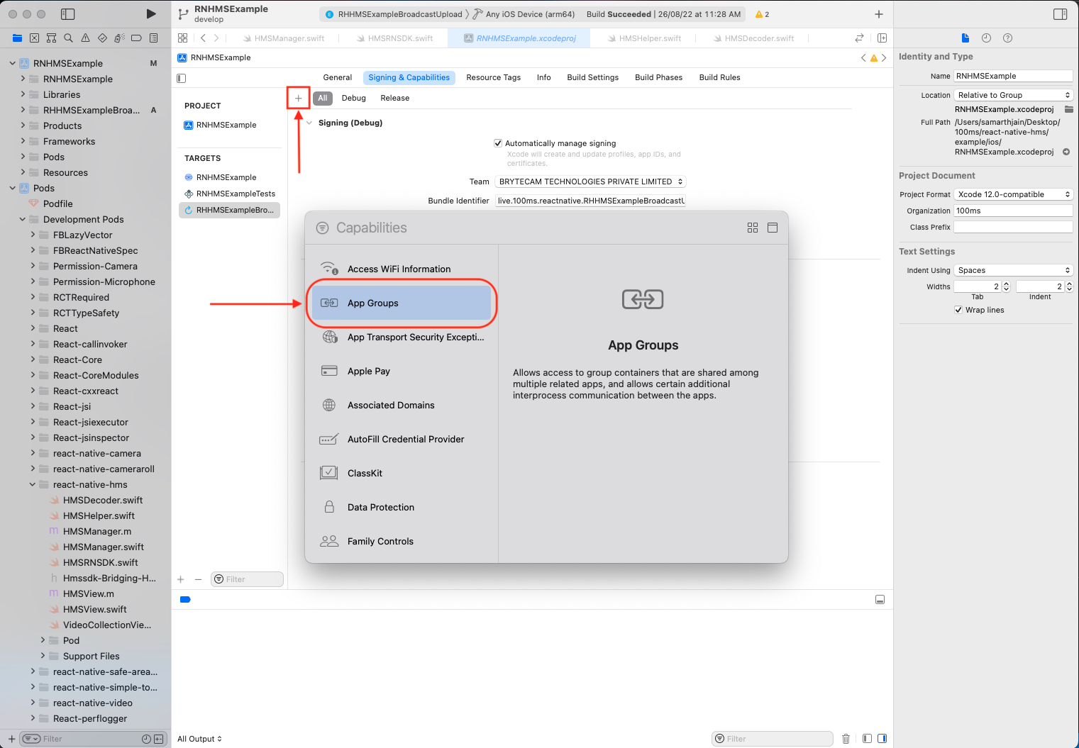 100ms Example Apps already have configurations for starting Screenshare on iOS devices. The values for App Group & Preferred Extension used in 100ms Example Apps cannot be reused by any other apps as they won't be linked to your Apple Developer Account.