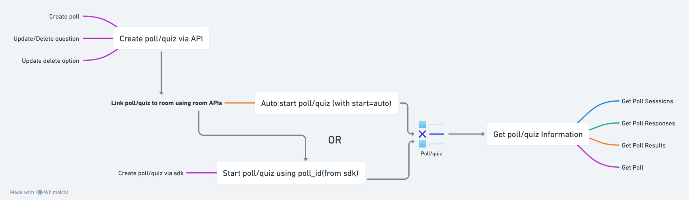 Polls and quizzes can be created/updated using these APIs. A recommended way to create a poll is to provide a list of questions while creating poll, then update those questions by modifying them using update question/delete question or update/delete options API.