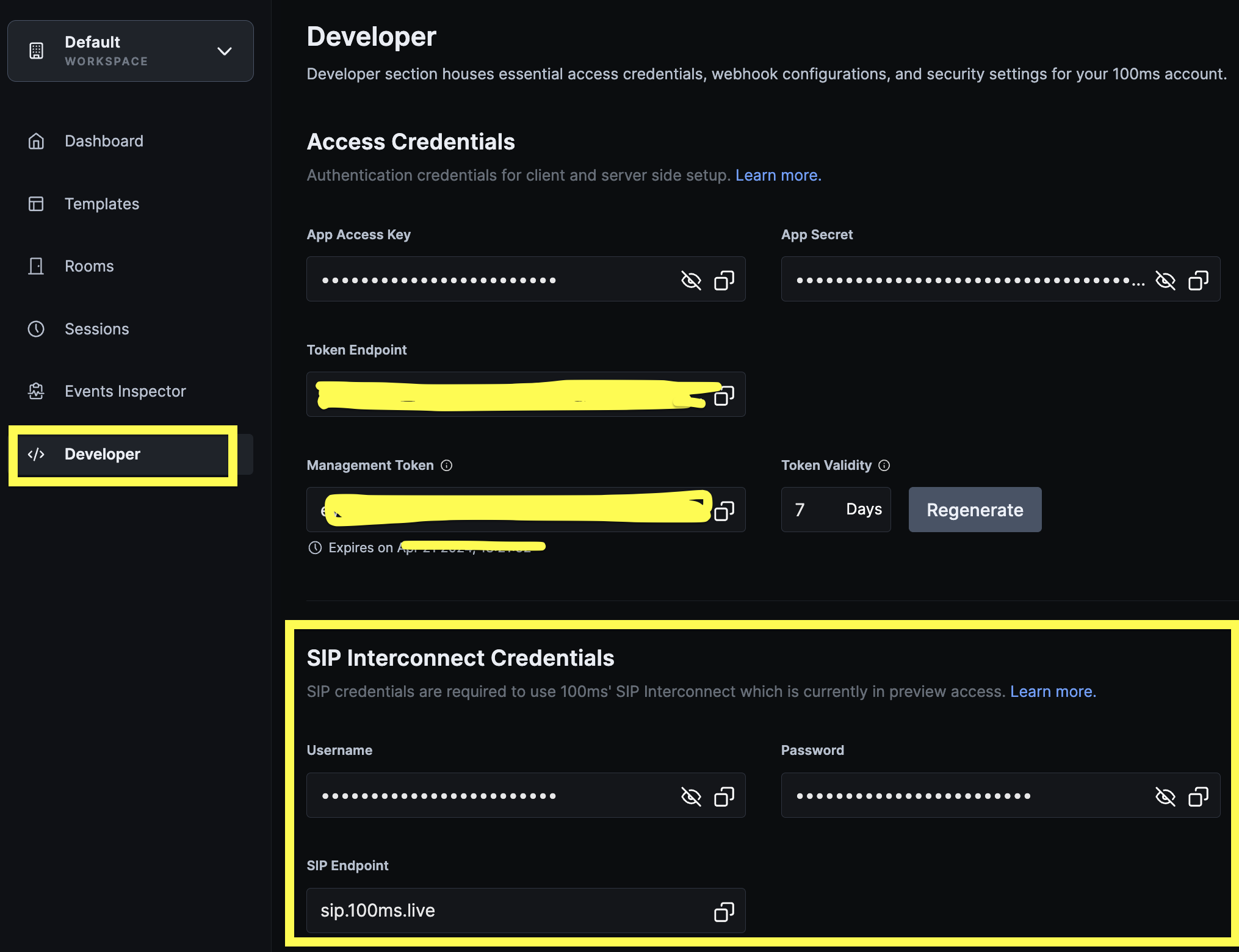 SIP Credentials are required to authenticate your requests to connect to 100ms’ SIP bridge in addition to our SIP Address. These credentials consist of a username and password for an account. These credentials are available in the 'Developer' section of the dashboard.