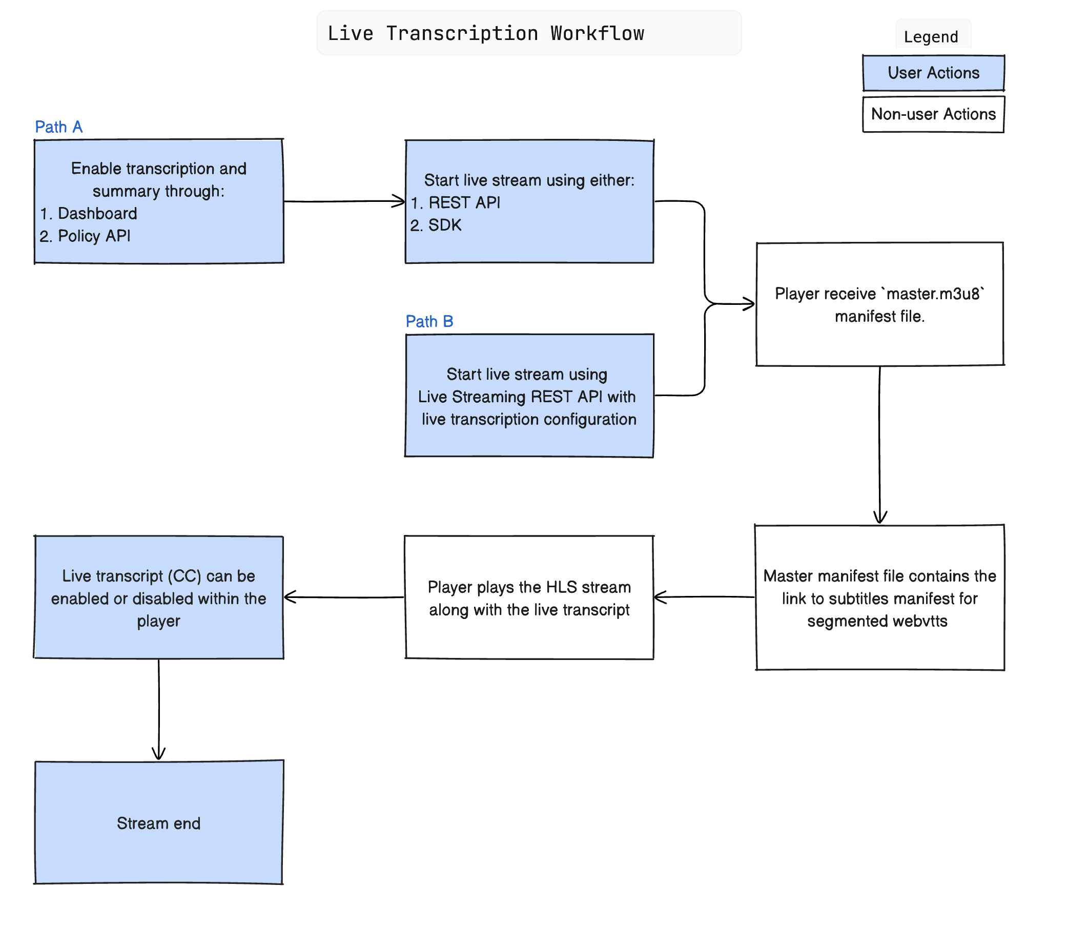 100ms is excited to offer auto-generated live transcription in English. The following flowchart illustrates the entire workflow of 100ms live transcription.