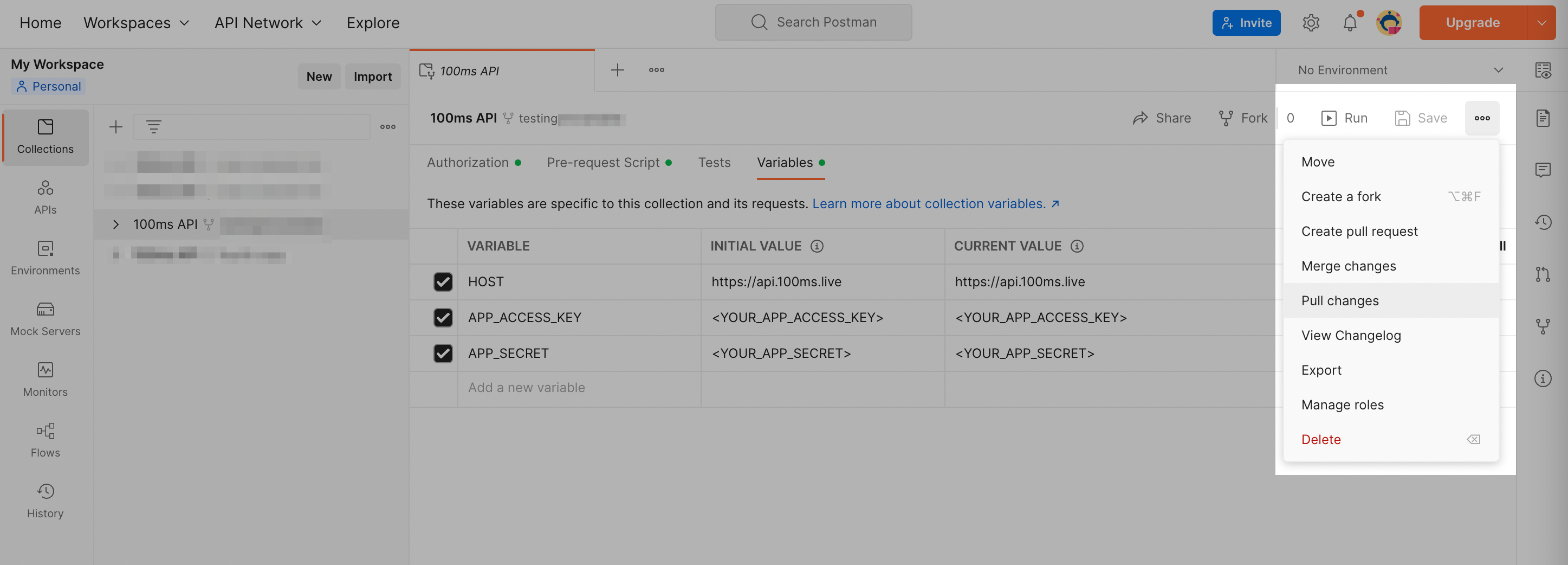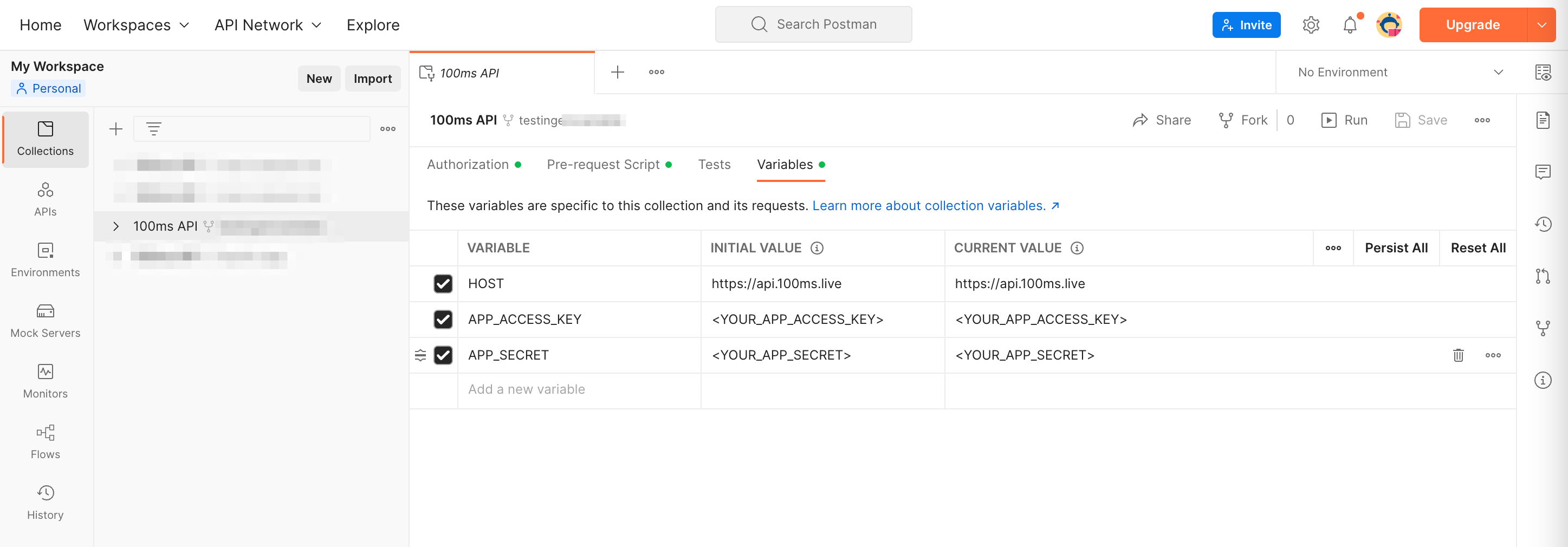 collection variable(TOKEN) in the forked Postman collection. - Automatically, this will be used as authentication for all the APIs in the 100ms collection.